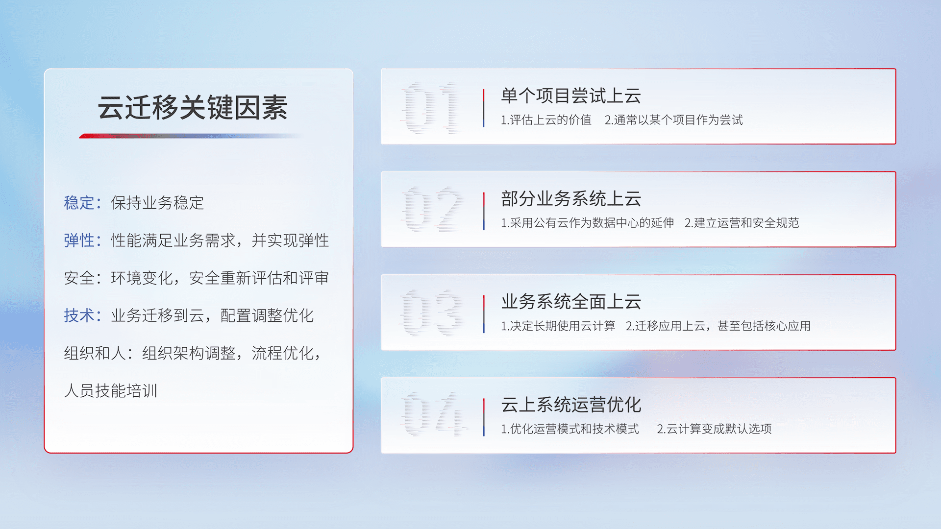 结合实际业务,,,从规划设计、、、云平台选型、、云原生改造、、、、数据迁移、、集成交付,,,迁移全过程为客户识别最佳上云路径,,做好风险识别管理,,设计网络架构、、、、身份权限、、、安全审计合规、、操作审计、、、、日志审计、、、、监控告警策略、、、多站点容灾设计等,,,对云上基础设施进行整体规划,,提升IT治理水平,,,以满足弹性、、、、高可用、、、高性能的需求。。。