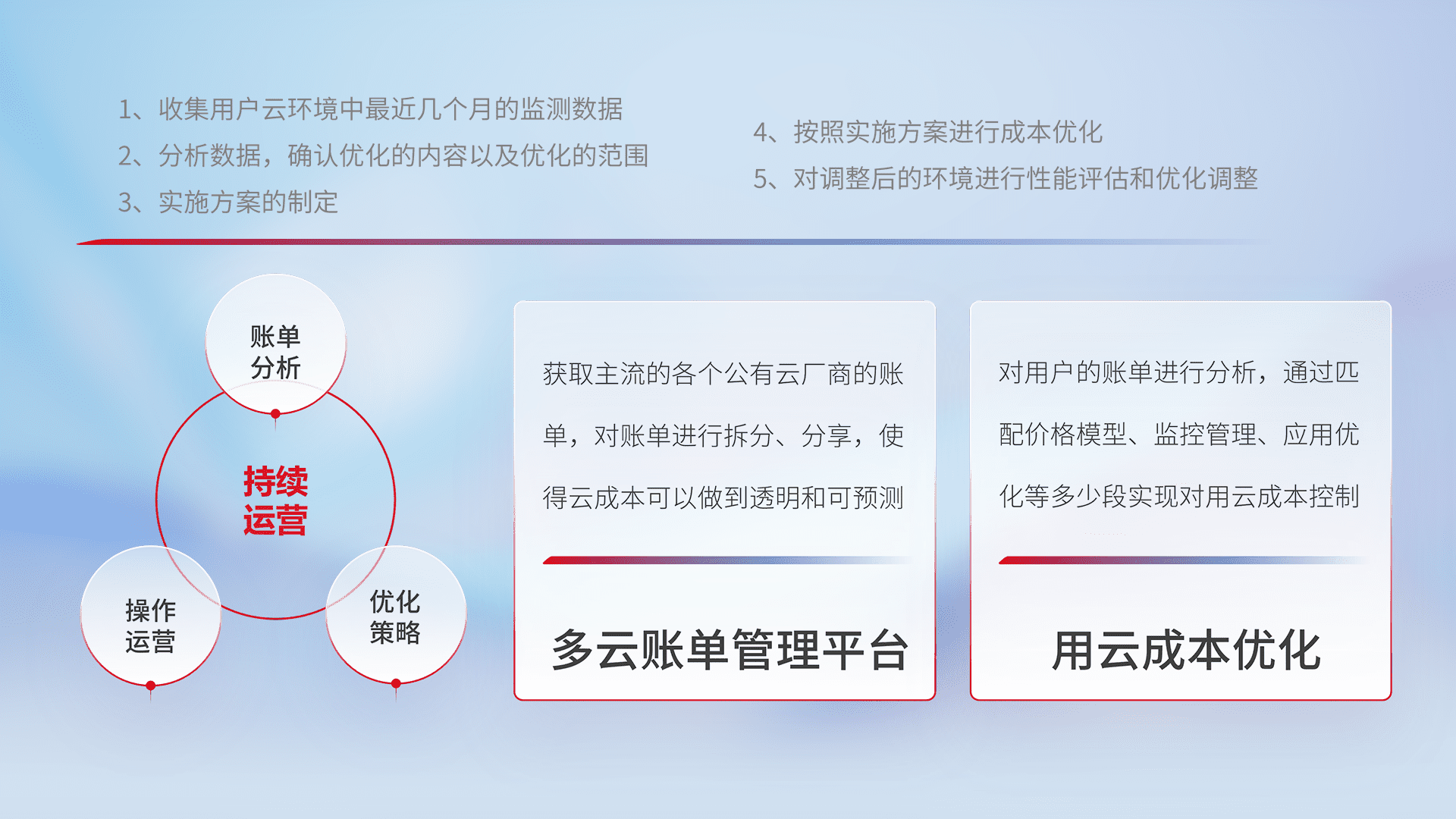 通过多云纳管,,以统一的资源数据模型把客户的云资源进行抽象和封装,,进而实现对多云资源的统一操作,,,保障云资源管理的可靠性、、、稳定性与可用性。。量身定制化运维内容,,配置、、、、开发运维、、、、补丁管理、、备份、、、、监控、、、、认证和访问管理、、审计和日常巡检等,,保障在用云过程中的可靠度,,,,稳定度以及高可用率。。。